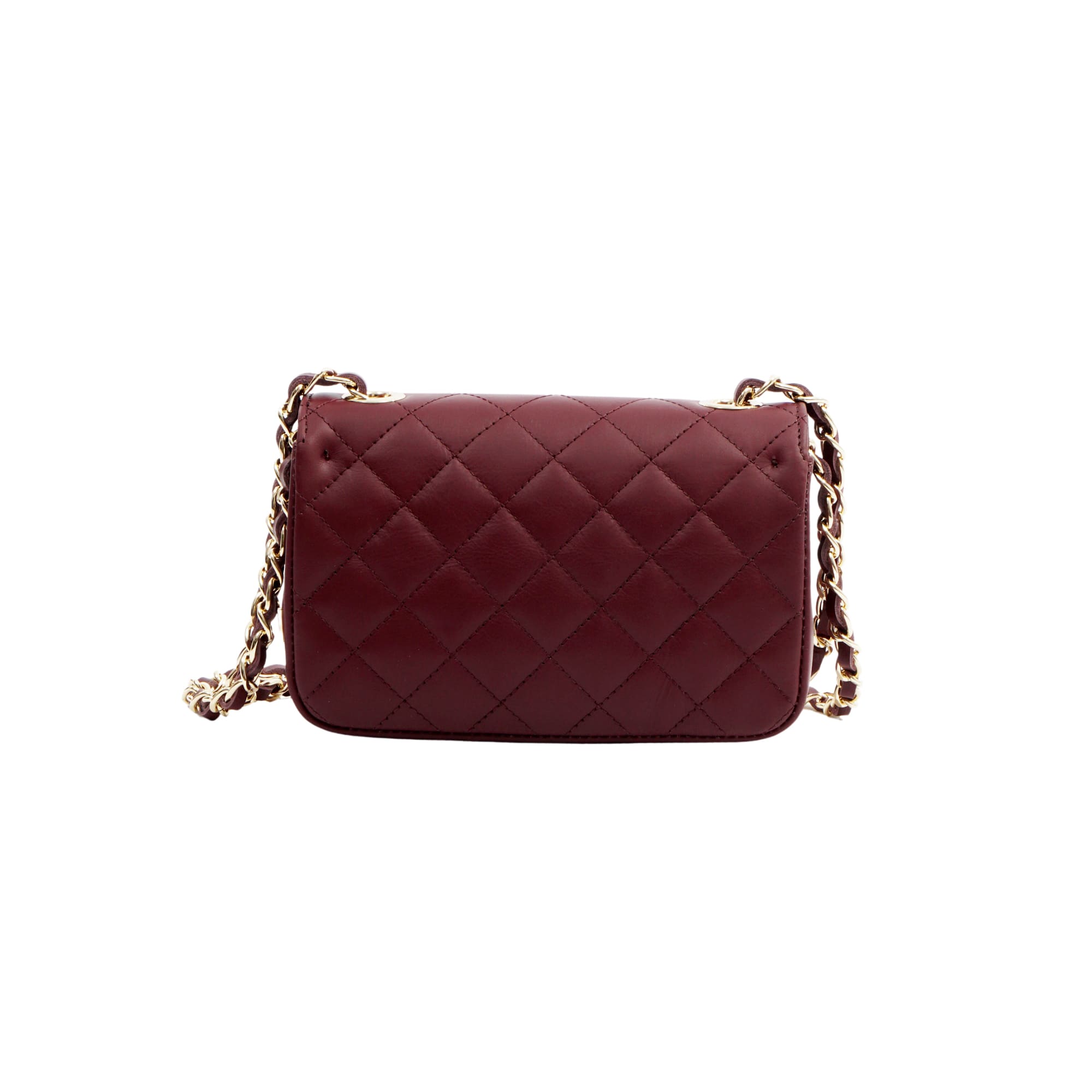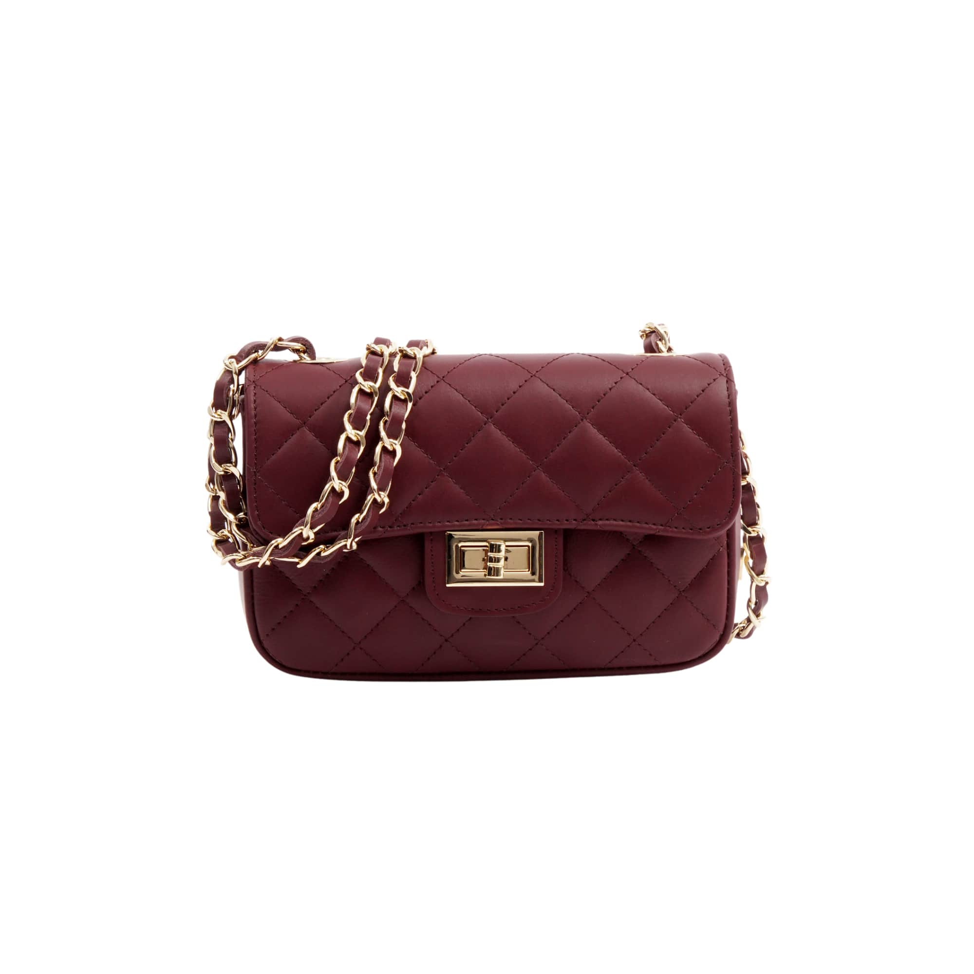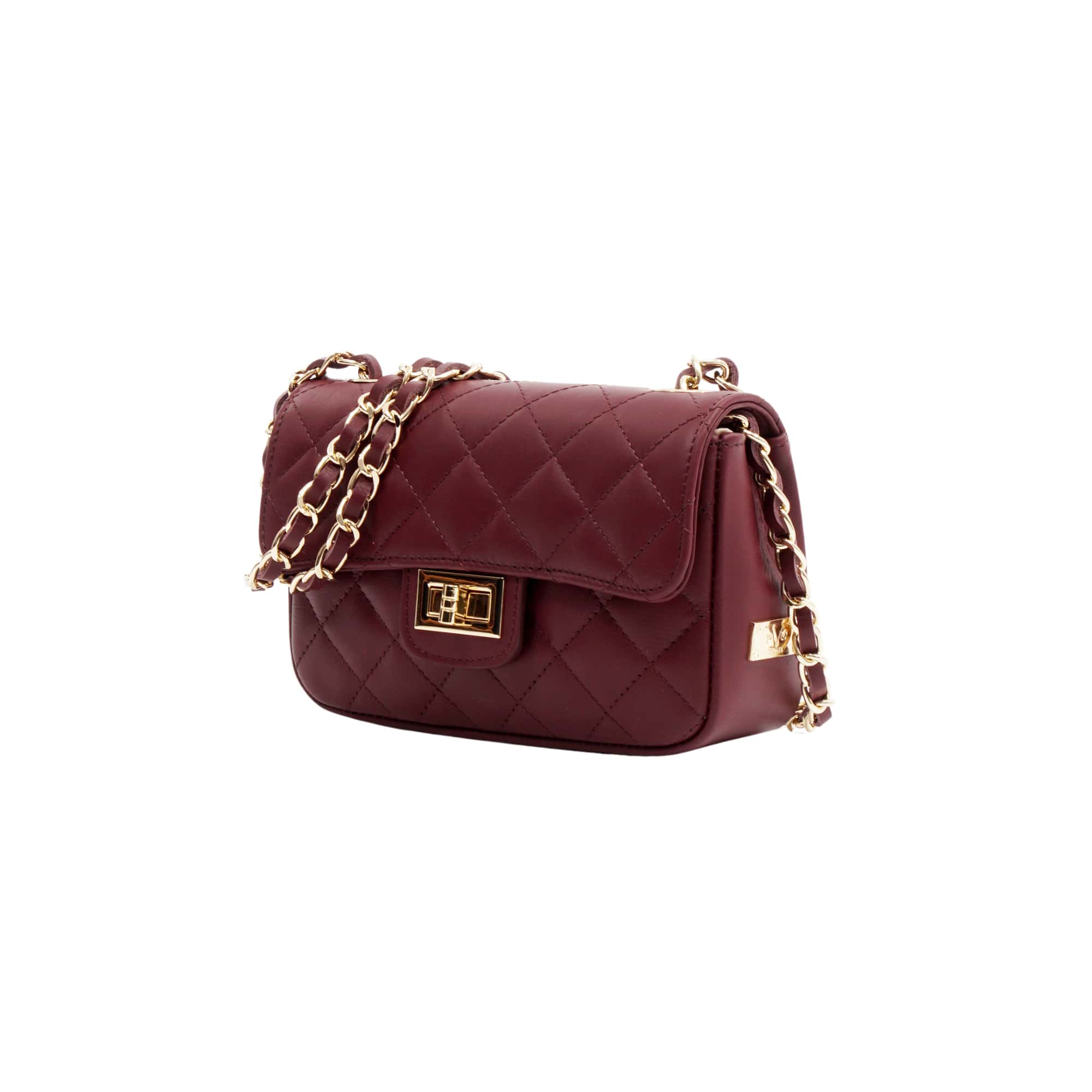 Γυναικείο τσαντάκι χιαστί με μεταλλικό λουράκι για τον ώμο. Διαθέτει μια εσωτερική βοηθητική θήκη που κλείνει με φερμουάρ. Ο κύριος χώρος της τσάντας κλείνει με μαγνητικό κλιπ. Είναι από 100% Ιταλικό δέρμα με χρυσές λεπτομέρειες.