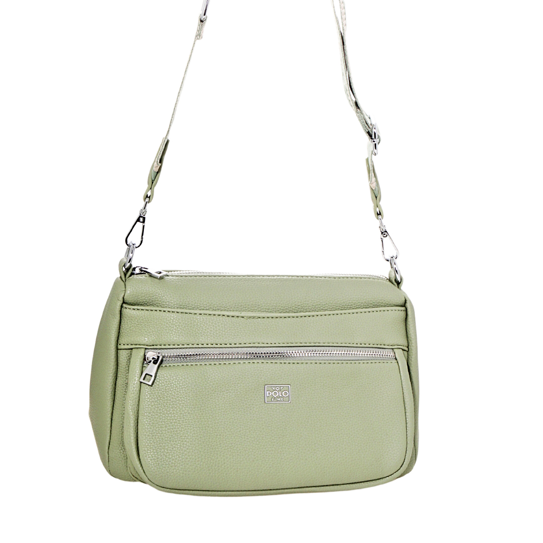 Τσάντα χιαστί με αποσπώμενο και ρυθμιζόμενο υφασμάτινο ιμάντα. Διαθέτει δύο βοηθητικές θήκες μπροστά, η μία κλείνει με φερμουάρ και η άλλη με μεταλλικό κλιπ. Στο πίσω μέρος της έχει μία βοηθητική θήκη με φερμουάρ. Στο εσωτερικό της διαθέτει δύο βοηθητικές θήκες. Ο κύριος χώρος της τσάντας κλείνει με φερμουάρ. Είναι από οικολογικό συνθετικό δέρμα με ασημί λεπτομέρειες.