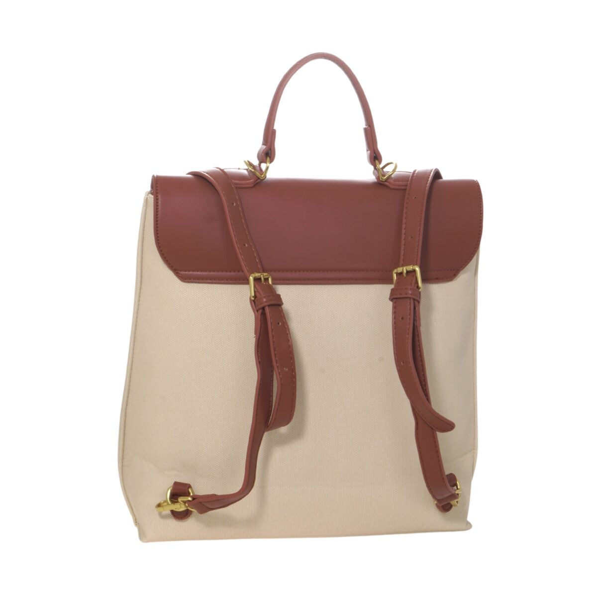 Τσάντα backpack με λουράκια αποσπώμενα και ρυθμιζόμενα. Ο κύριος χώρος της τσάντας κλέινει με φερμουάρ και επιπλέον με μεταλλικό κούμπωμα. Στο εσωτερικό της διαθέτει δύο βοηθητικές θήκες. Είναι από οικολογικό συνθετικό δέρμα με χρυσές λεπτομέρειες.